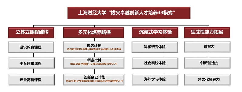 《方案》提出,在原“卓越财经人才培养33模式”的基础上提质拓维,积极构建以“立体课程、多元培养、沉浸体验、能力生成”为特征的“拔尖卓越创新人才培养43模式”(以下简称“43模式”),“43模式”聚焦教育数字化转型、拔尖创新人才培养、自主教材体系构建、专业交叉融合、通识教育再提升等,系统性、整体性、协调性地推进本科教育高质量发展,全面提升有组织的人才自主培养能力,着力培养适应国家发展战略需要和全球化竞争的拔尖卓越创新人才。为实现党的二十大提出的以中国式现代化推进中华民族伟大复兴、以高质量发展全面建设社会主义现代化提供人才支撑。