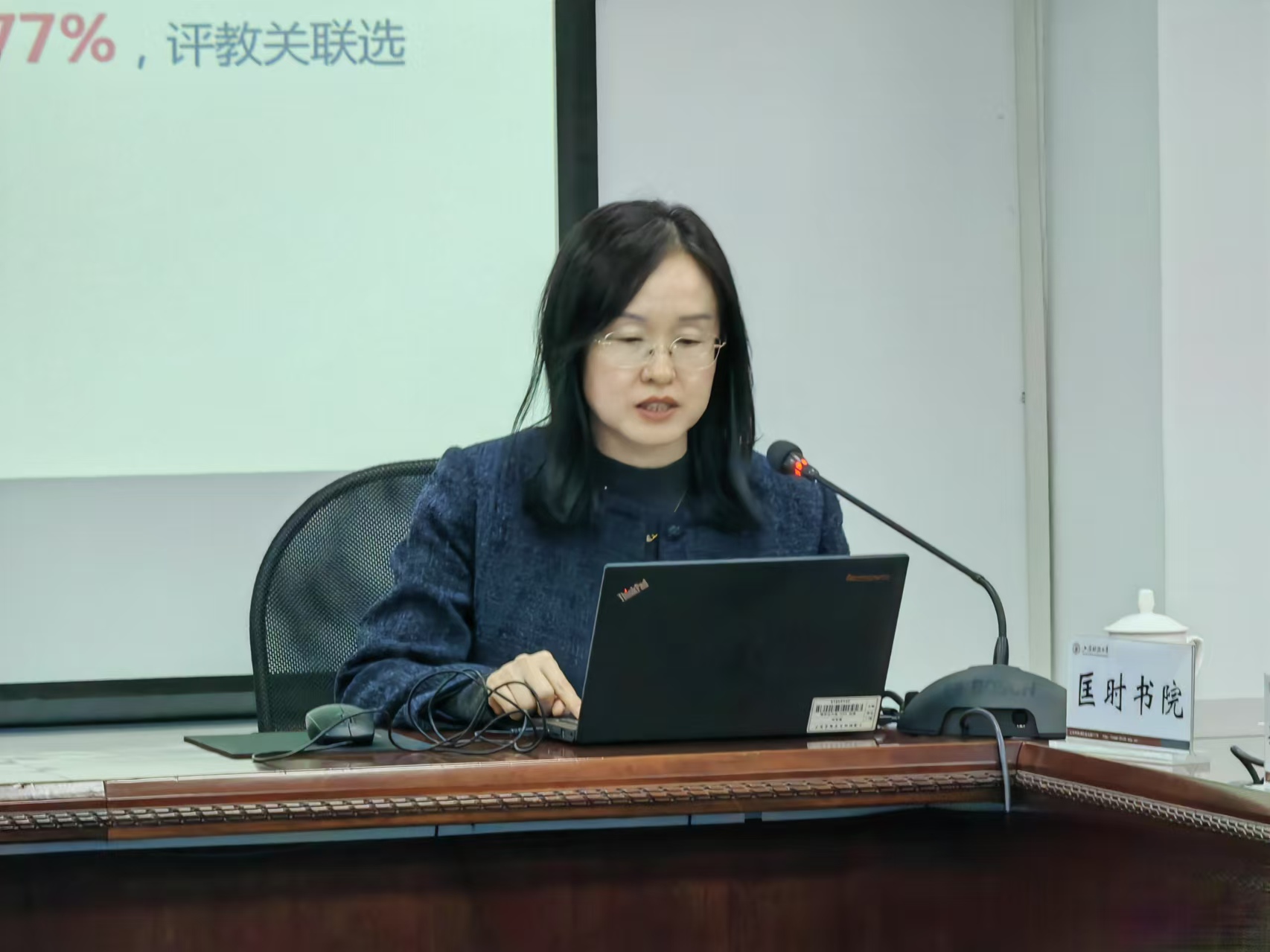 教务处韩婷副处长围绕学生评教、听课评价、教授给本科生上课情况、教学制度汇编以及在校生学习体验调查通报了质量保障工作。她介绍,本着应排尽排的原则,教授为本科生授课的比例有了显著提升。此外,按照新一轮本科教育教学审核评估强调的“大质保”理念,教务处协同相关职能部处,梳理了教育质量管理体系涉及的教育教学相关制度,形成《上海财经大学本科教育教学质量管理制度汇编》,为2025年本科教育教学审核评估工作顺利进行做好准备。最后,她深入解读了在校生学习体验调查的结果,建议各院系从中提炼优势,以此丰富审核评估自评报告的内容,并针对薄弱环节进行改进,以更充分的姿态迎接即将到来的教育教学审核评估工作。